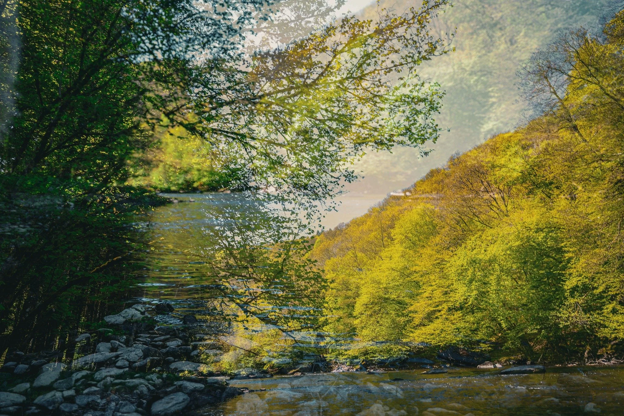 L’eau bavardait sur les pierres,